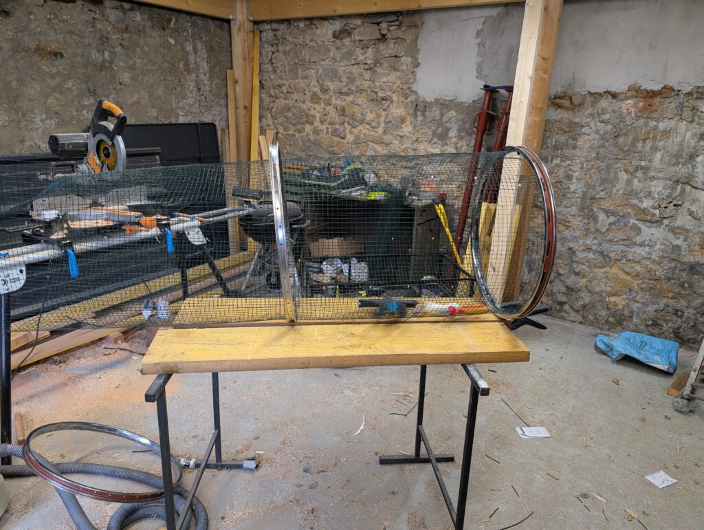 J’ai récupéré des vielles jantes de vélo et j’ai acheté 10m x 1m de grillage maille 12mmx12mm