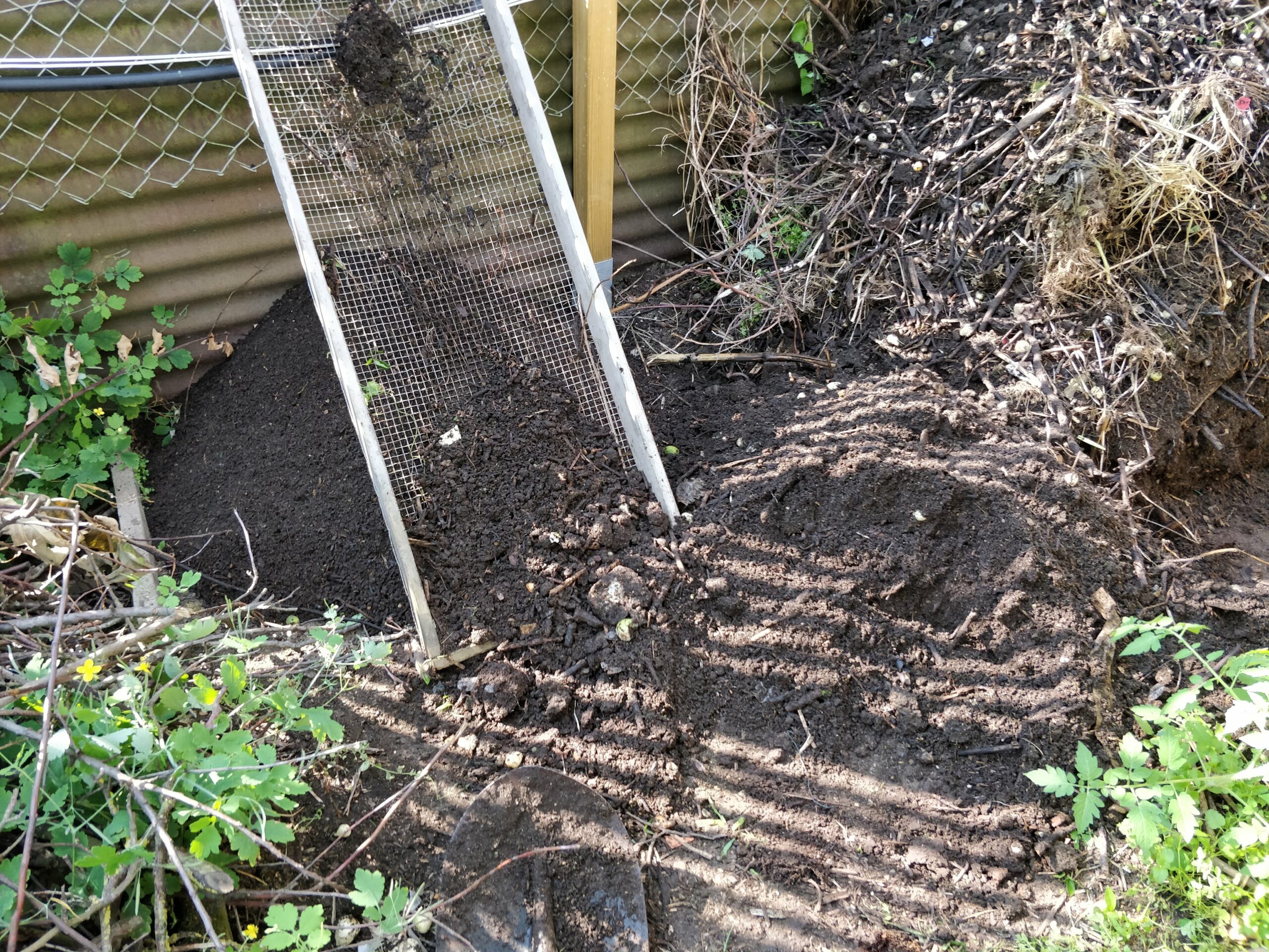 Voici la version 2018 de mon tamis : un cadre en bois et un grillage agrafé. Vous le posez contre un support vertical. En posant la terre dans la partie basse, elle se tamise mécaniquement en descendant.