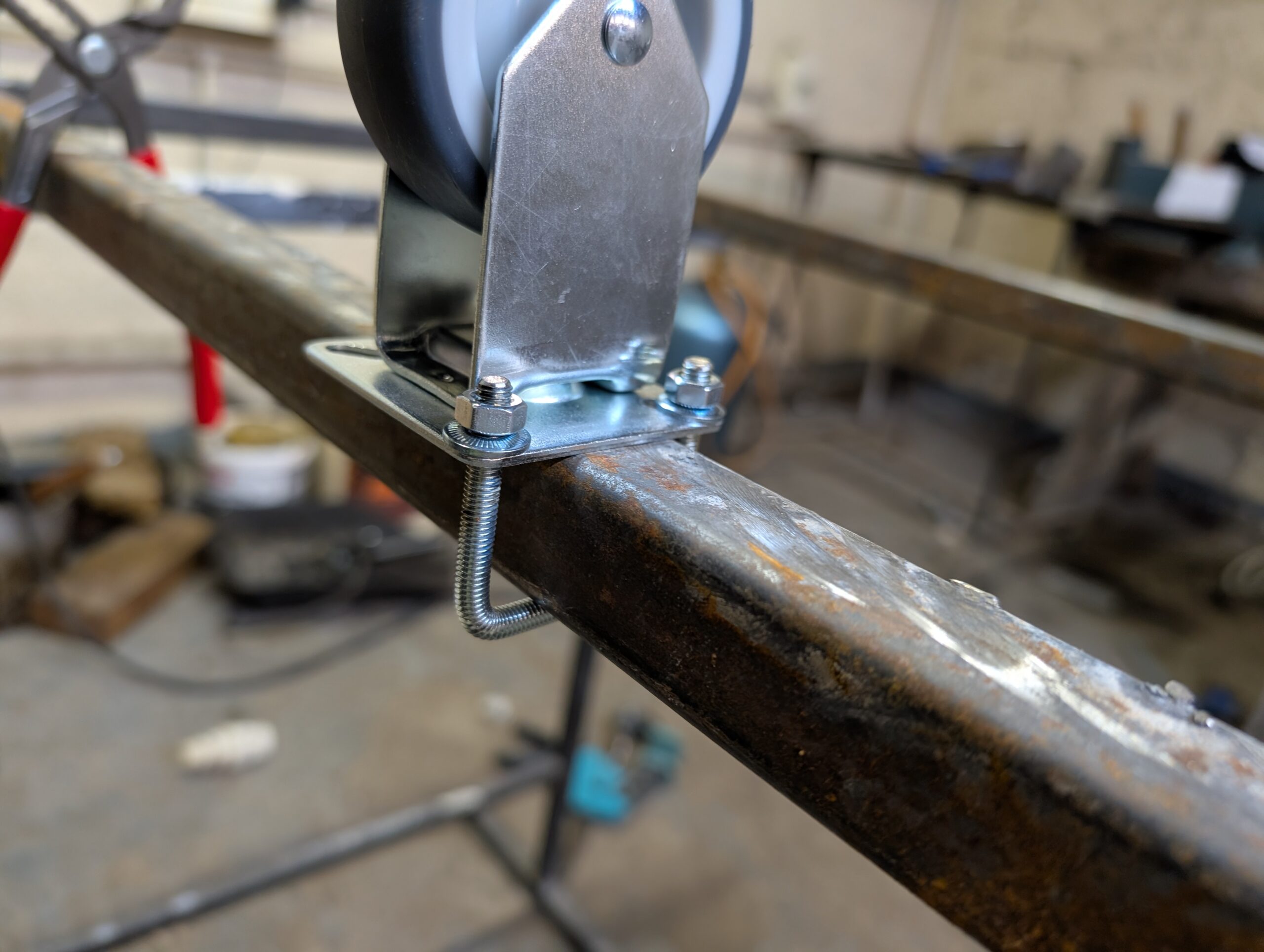 Fixation des roulettes avec un système maison. Rondelle frein pour éviter le desserrage avec les vibrations.
